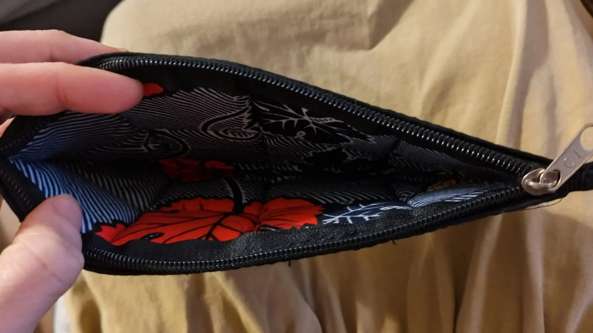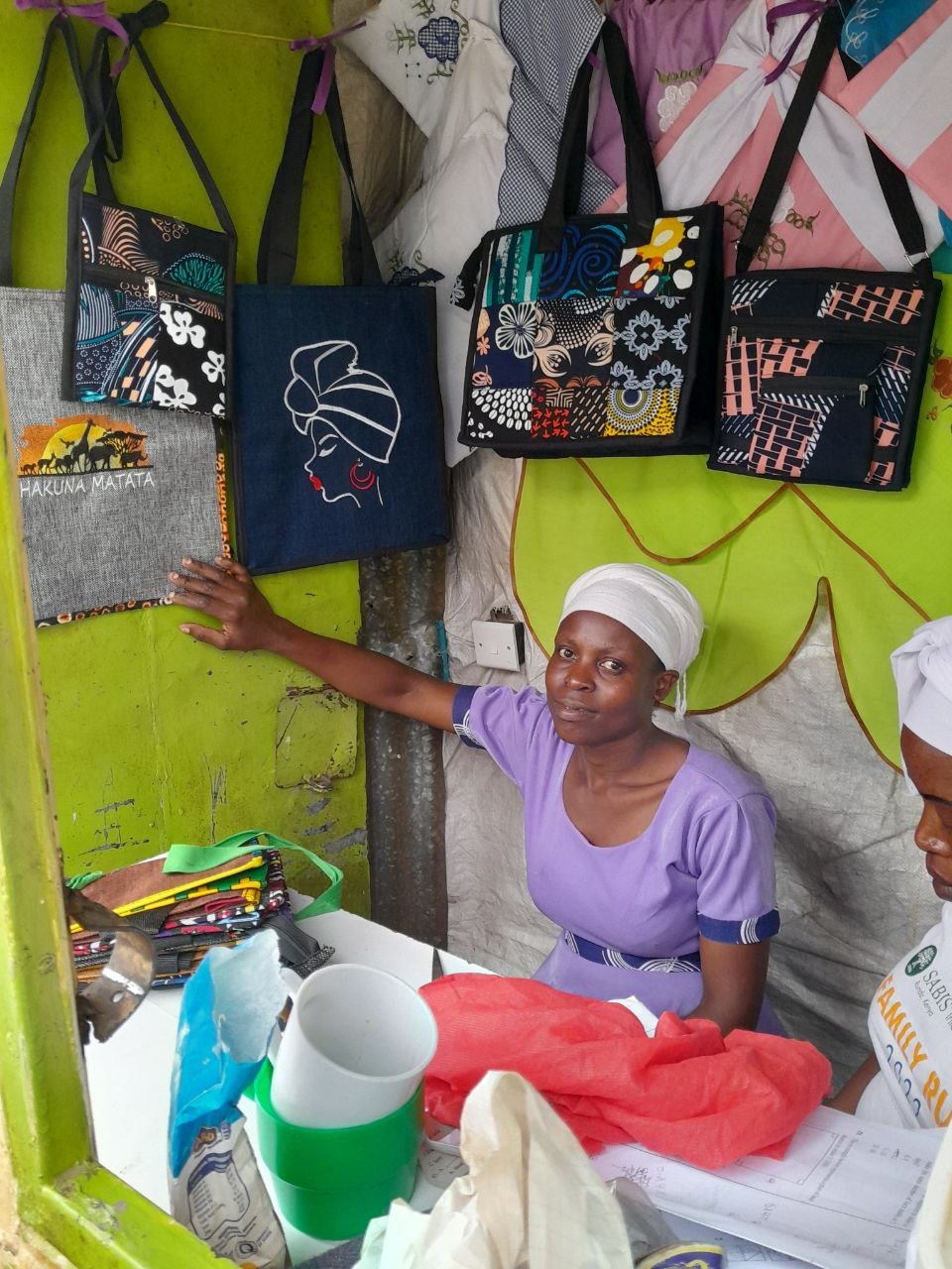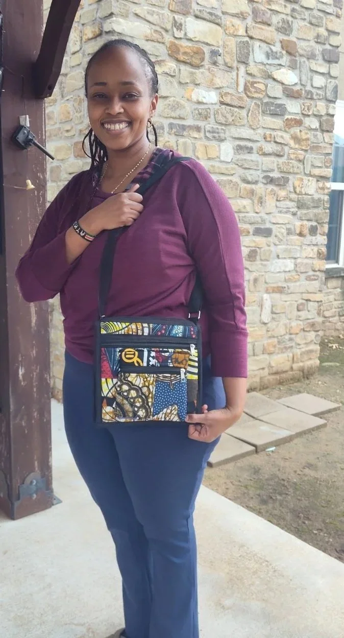 This lovely purse, handcrafted in Kenya, bought directly from the seamstress pictured on our main photo at the top of the page, (along with all the other bags we sell). It has three separate pockets each with a full zipper closure. The main pocket is divided down the middle by a unique padded divider to help you stay organized. Nice long adjustable webbing strap. Main pocket is about 9” x 9” with the top opening being about 8” wide. Holds a cell phone and wallet, keys, and change along with some other essentials nicely, great for running errands and keeping all your essentials handy in one small convenient purse.