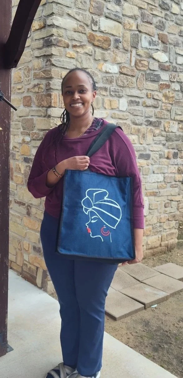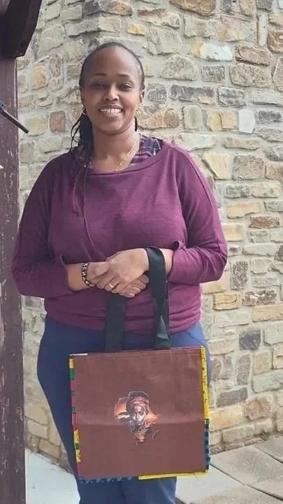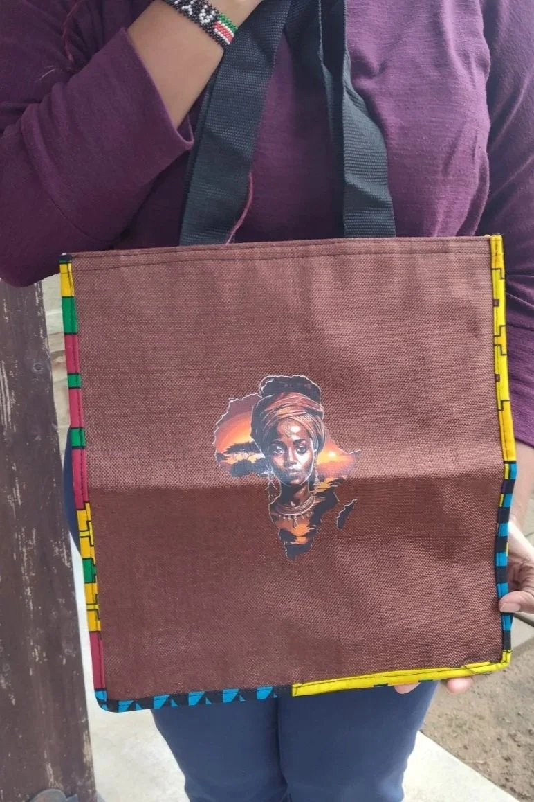 There is an image of the African continent on one side of the bag with a face of an African woman adorned in traditional jewelry. Unique One of a Kind Bag!